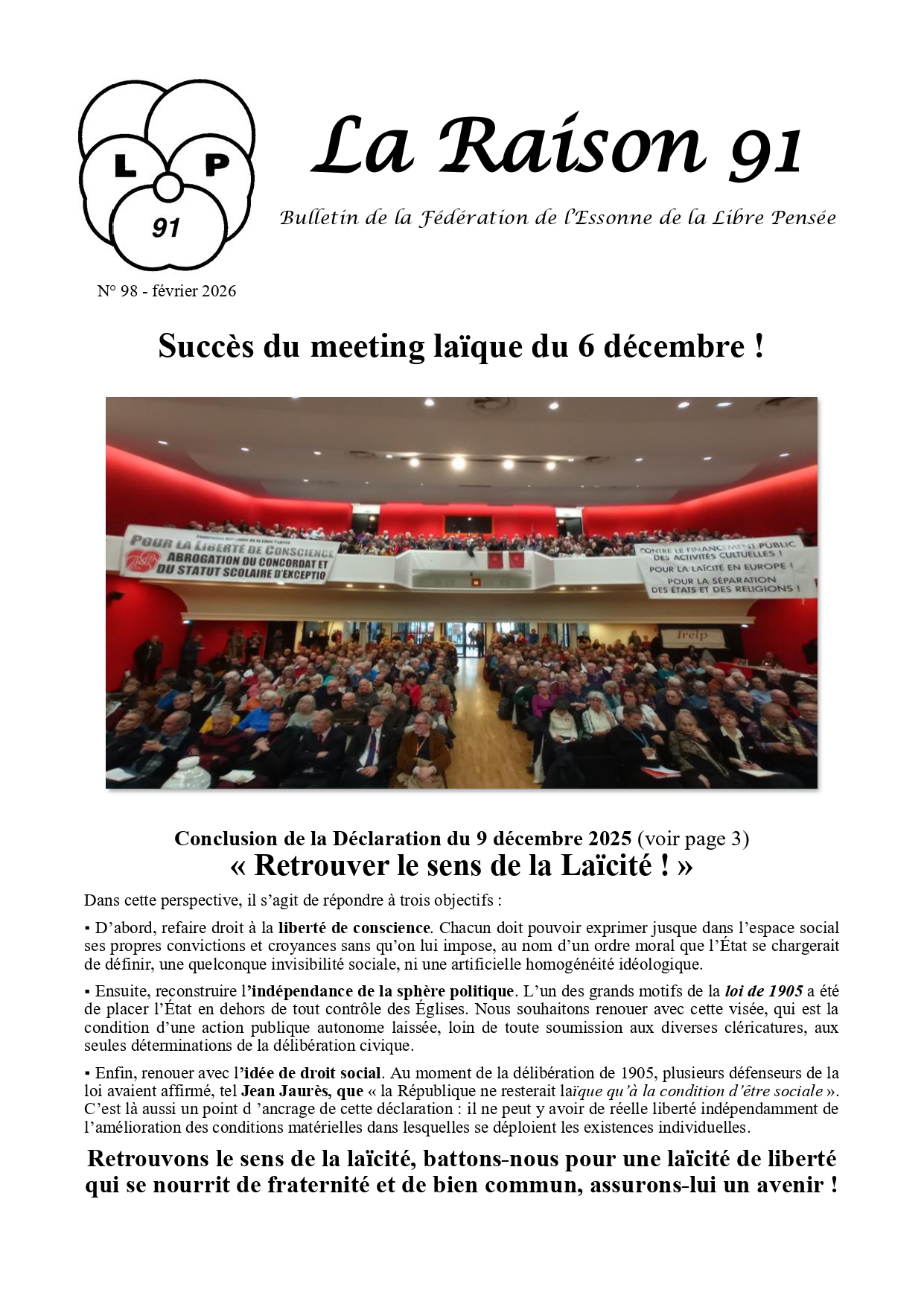 Ce premier numéro de l’année 2026 rend compte du meeting laïque du 6 décembre à Paris et du Congrès fédéral du 24 janvier à Marcoussis, donc des débats et des grandes orientations pour les mois à venir :