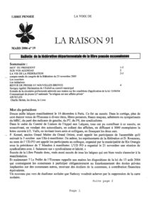 P. Kessel, ancien Grand Maître du Grand Orient, avait appelé les participants de l’assemblée qu’il animait le 5 octobre aux Ulis à manifester. De même, les représentants de la fédération et D. Rousseau, au nom de’ UD.FO ont appelé les participant~ au colloque, organisé par la municipalité de Ris Orangis sous la présidence de T Mandon à manifester. L’UD FO a organisé le 21 novembre une réunion de syndicalistes avec J. Salamero sur« syndicalisme et laïcité.» Succès de la Libre Pensée donc, mais aussi succès de tous les laïques qui ont bien voulu s’associer à la manifestation.