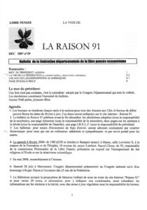 2- Le bulletin la Raison 91 publiera avant la fin décembre: les résolutions adoptées (sous la responsabilité de la secrétaire), une page trésorerie (sous la responsabilité de la trésorière), deux pages sur les atteintes à la laïcité (sous la responsabilité de Danielle), une page I.R.E.L.P. (sous la responsabilité du président)