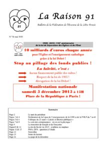 Au congrès départemental du 13 juin 2015, à Marcoussis, préparatoire au congrès national à Creil, nous rendrons compte de nos démarches auprès des organisations qui se réclament de liberté de conscience en Essonne et de la préparation de la manifestation nationale du 5 décembre prochain.