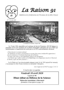 Ce premier numéro de La Raison 91 de l’année 2020 donne une large place à ces propositions et à la rubrique « Ainsi va l’Essonne… ». Et il y a de la place dans les rangs de la Fédération en adhérant, en réglant sa cotisation au tarif décidé pour 2020, pour préparer les combats à venir dans une Libre Pensée plus forte, laïque, démocratique, sociale, féministe, pacifiste et internationale. Je vous souhaite bonne lecture de ce numéro.
