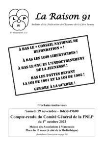 Nous avons tout à gagner au renforcement de la Libre Pensée organisée et à réfléchir ensemble sur les bases et sur les formes de la constitution d’une Confédération dont le socle pourrait être l’action commune pour le retrait de la loi Séparatisme, pour la défense de la loi de 1901 – liberté d’association – et de la loi de Séparation de 1905.